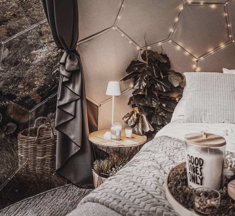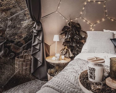 With its cozy, upholstered and insulated interior, DDdome's Glamping Dome is the perfect intimate space for couples. It easily fits a queen-size bed and offers 180° panoramic views of the surroundings. At night it allows your guests to lay under the stars and gaze upon the stunning views of the night sky.